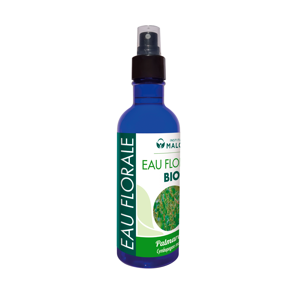 Eau florale obtenue par distillation par entrainement à la vapeur d’eau des feuilles de Palmarosa bio.
