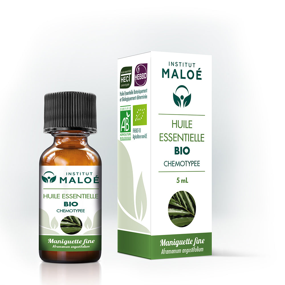 Huile essentielle obtenue à partir de la distillation des feuilles de Maniguette fine bio.