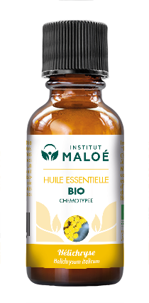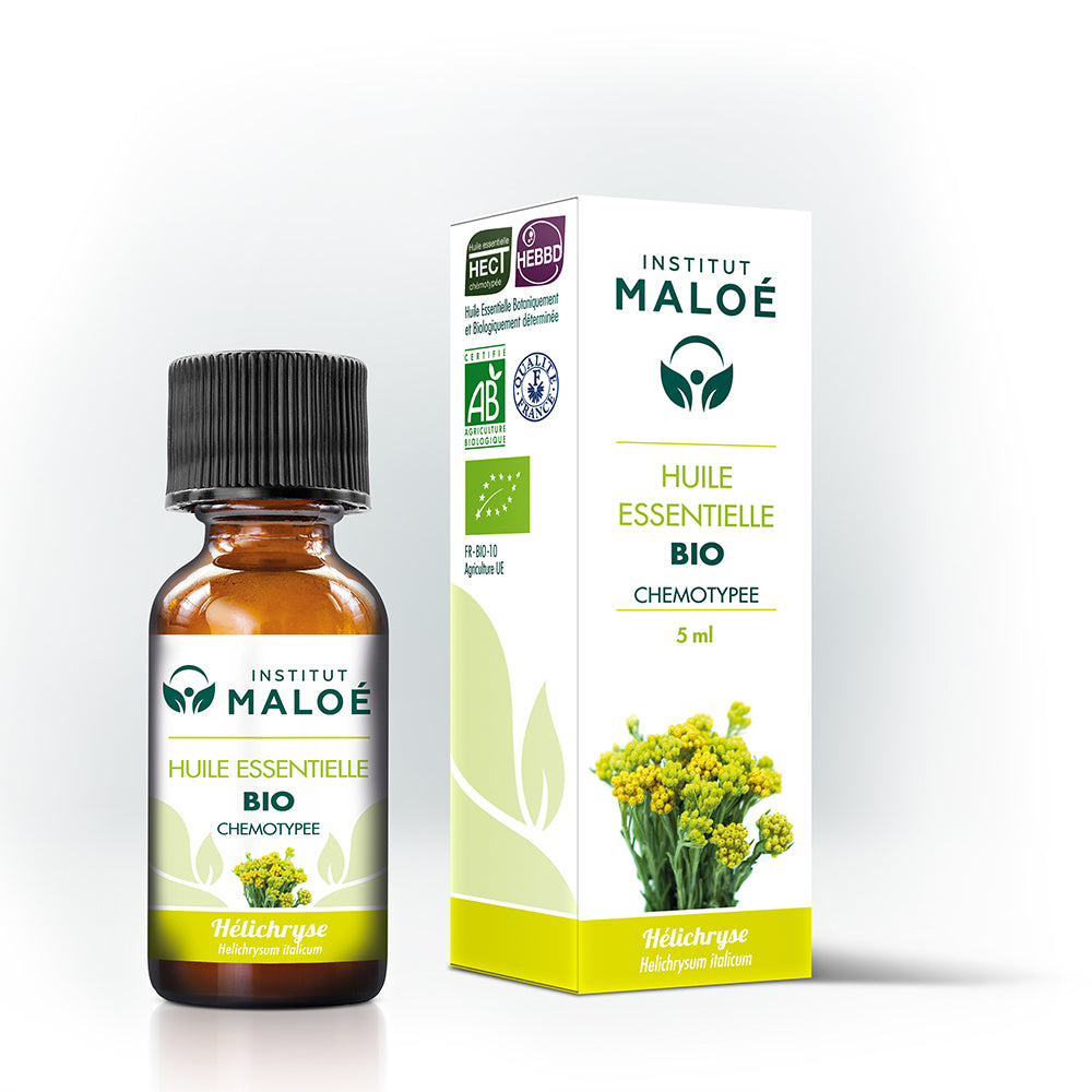 Huile essentielle obtenue à partir de la distillation des sommités fleuries d'Hélichryse bio.