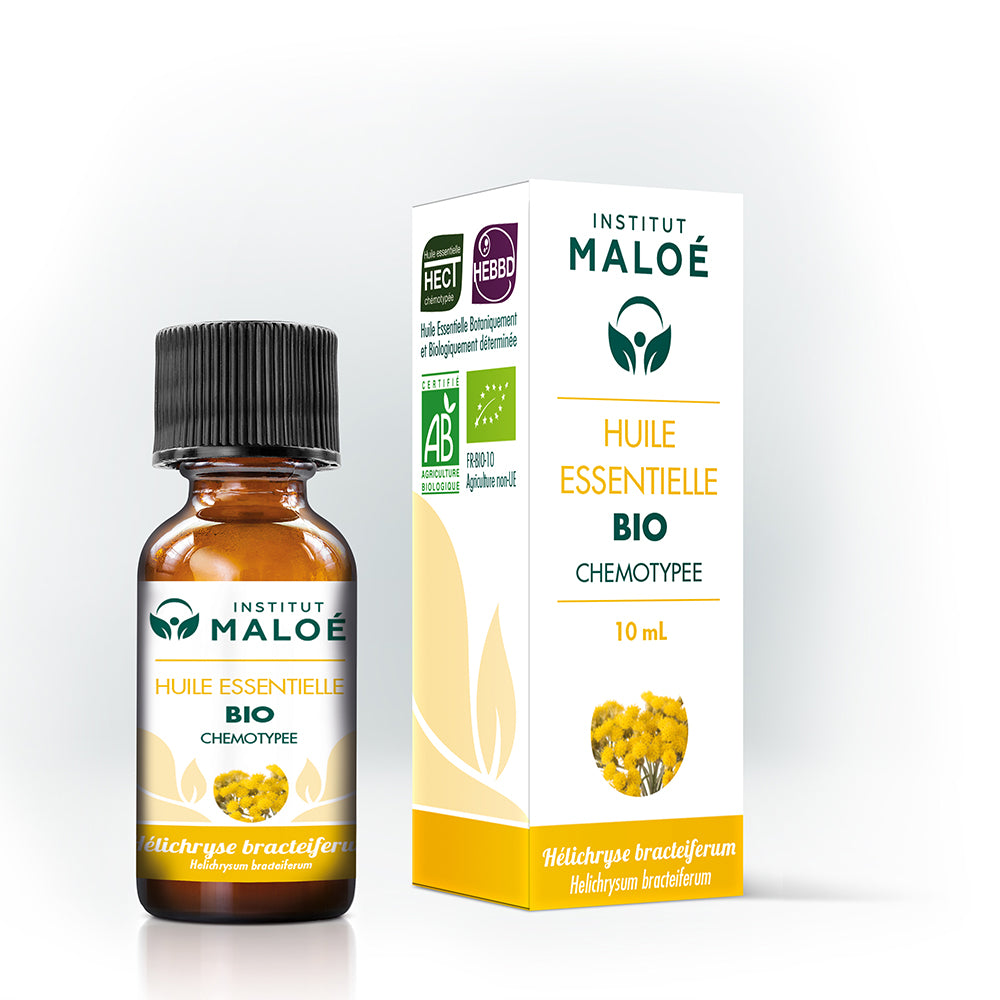 Huile essentielle obtenue à partir de la distillation des fleurs d'Hélichryse bracteiferum bio.