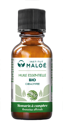Huile essentielle obtenue à partir de la distillation des sommités fleuries de Romarin à camphre bio.